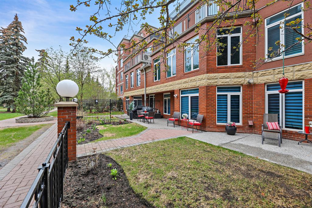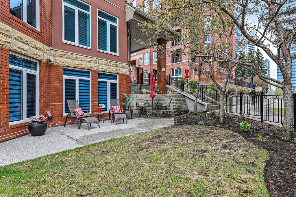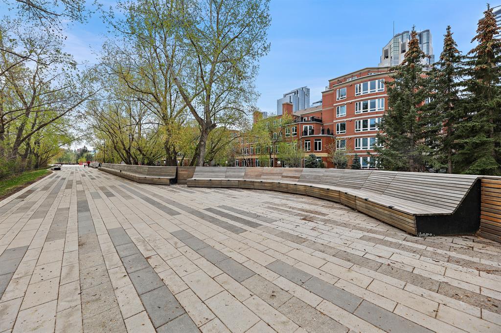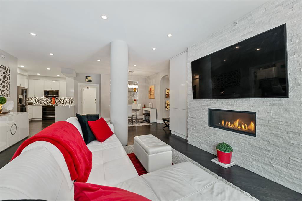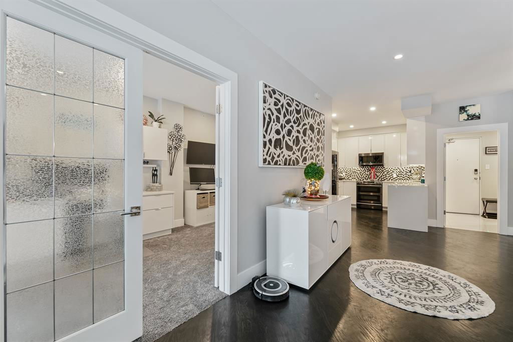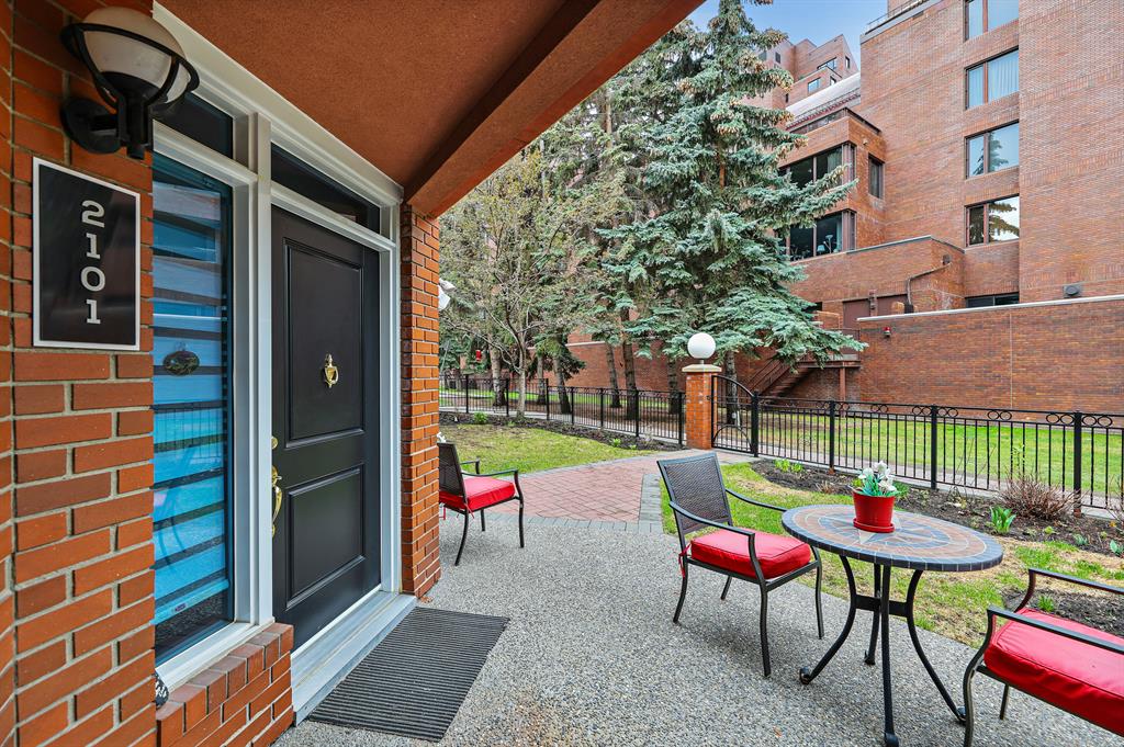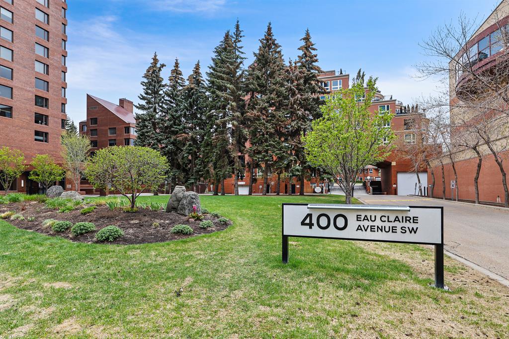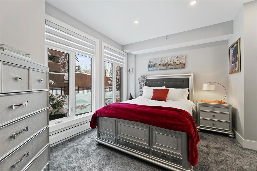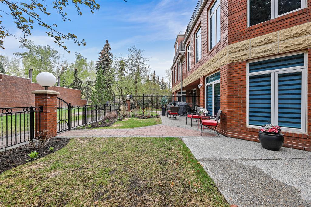 ABSOLUTELY ONE OF THE FINEST INNER CITY CONDO’S THAT CALGARY CAN OFFER! Rare main floor Eau Claire Estates condo with 2 bedrooms / 2 bath home. Truly a modern lifestyle living experience in an secure apartment setting – custom designed and built with extensive renovations, upgrades and superior concrete building quality. Over 1218 + square feet plus an exclusive outdoor fenced living area with a dual patio layout and private entry, in the heart of the city. You’ll be impressed with the inner city walkability to shops, restaurants, schools (private , daycare & public), LRT, pathways, health care needs, and all with expansive views of Prince’s Island Park and city downtown core. The island offers an abundance of year round outdoor “all age activities” such as, arts and music festival events, River Café restaurant, playground, biking, project and rental tool site, walking trails, skating, and minutes to the Zoo and Science Centre. Check out the pictures, and 3D tour video. Rich curb appeal with architectural features, extensive upgrades inside and the details are superb. Grand entry with a beautifully appointed open floor plan with high 9′ ceilings and hardwood floors. Chef’s kitchen includes spectacular white quartzite counter tops, full-height custom white gloss cabinets doors, slide in smooth top electric stove with an overhead microwave hood fan, dark grey stainless steel appliances, under mount black granite sink, wall pantry, custom tiled back splash, and a large dining with a built in wall hutch and more views. You’ll also enjoy the entertaining potential with the open layout showcasing the adjacent living room with a elegant white stone faced gas fireplace. The 16′ x 14′ living room features large bright west facing windows and easy access to outdoor patio living space. South patio – 19′ x 10′ + North patio 14′ x 11′. A stately main floor den / office / bedroom with a glass french doors and a walk-in closet. Offering modern lifestyle flexibility for your home office. Other convenient features include a back foyer with direct access to your titled parking stall, storage locker, In suit laundry room, private half bath, and no need to wait for an elevator with your grocery’s or packages. In suit laundry room. A central hallway separates the primary bedroom and full bath. The main primary bedroom includes more views of the private south patio, a spa like ensuite with dual under mount sinks, over-sized jetted tub with 10 mil glass door, and a expansive walk in closet complete this stunning owners suite. BONUS: under ground visitor parking stalls, very unique and fenced street-side entrance into unit, assigned storage locker – #72, pet friendly, and the home is ready to move into and enjoy this summer. Call your friendly REALTOR(R) to book a viewing!