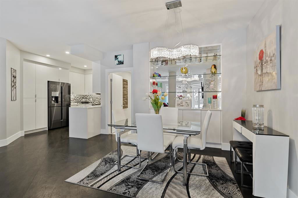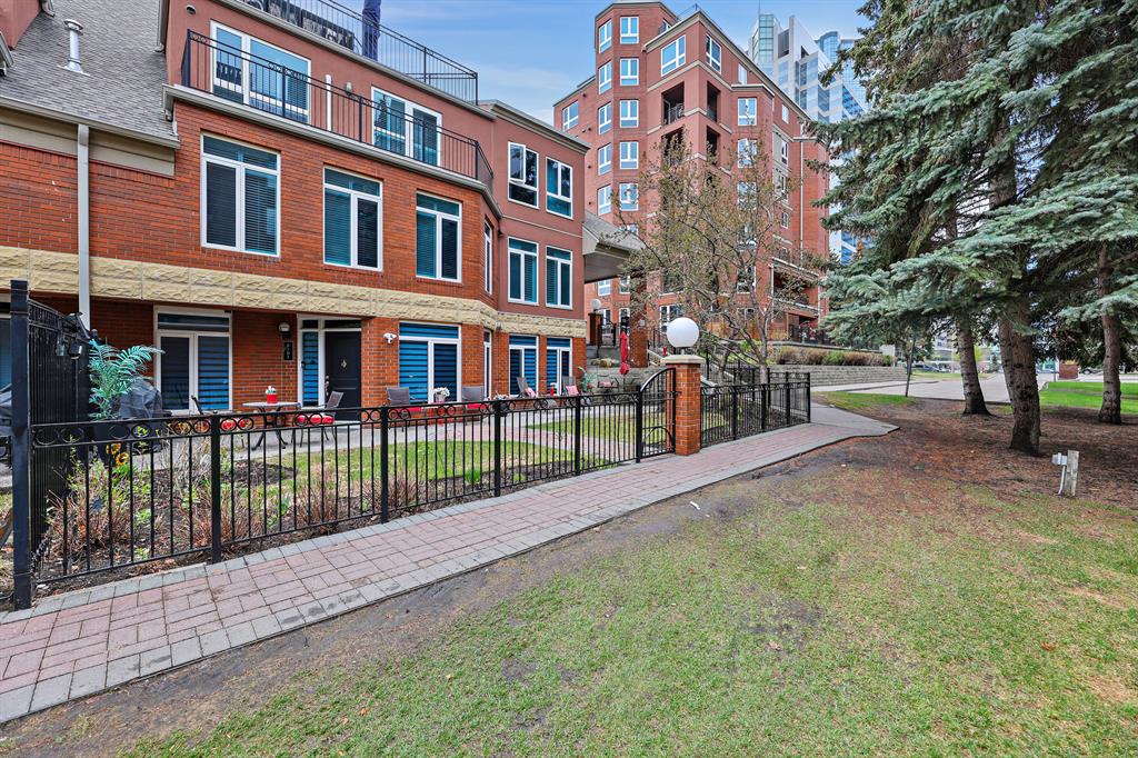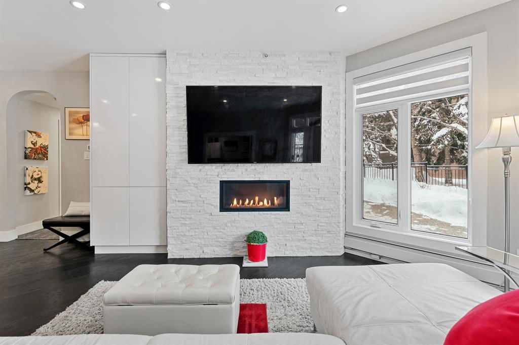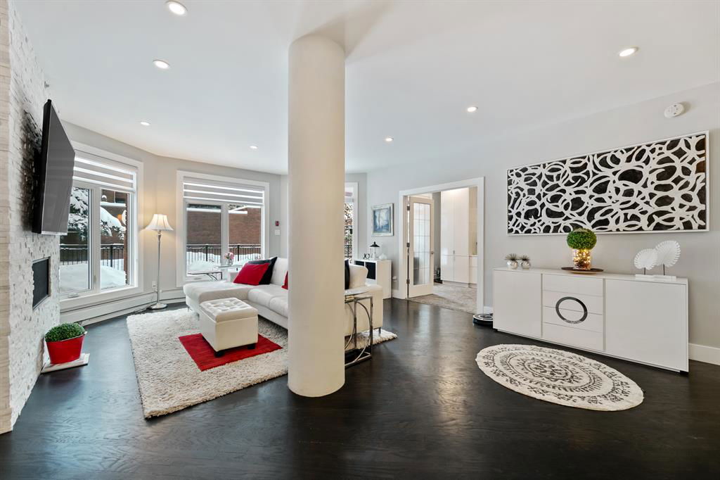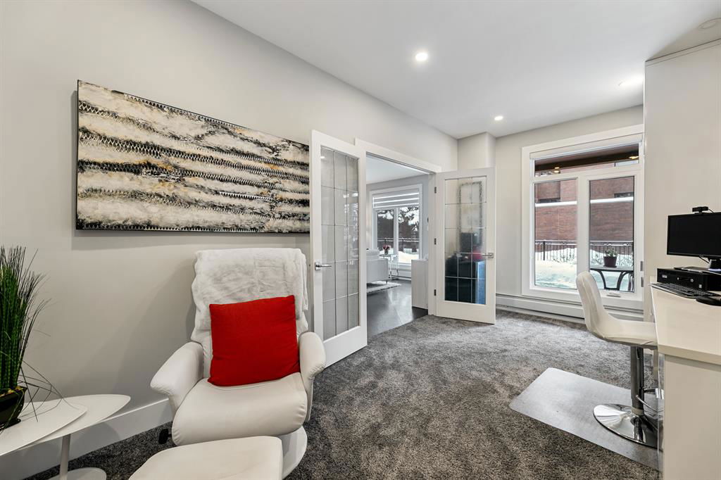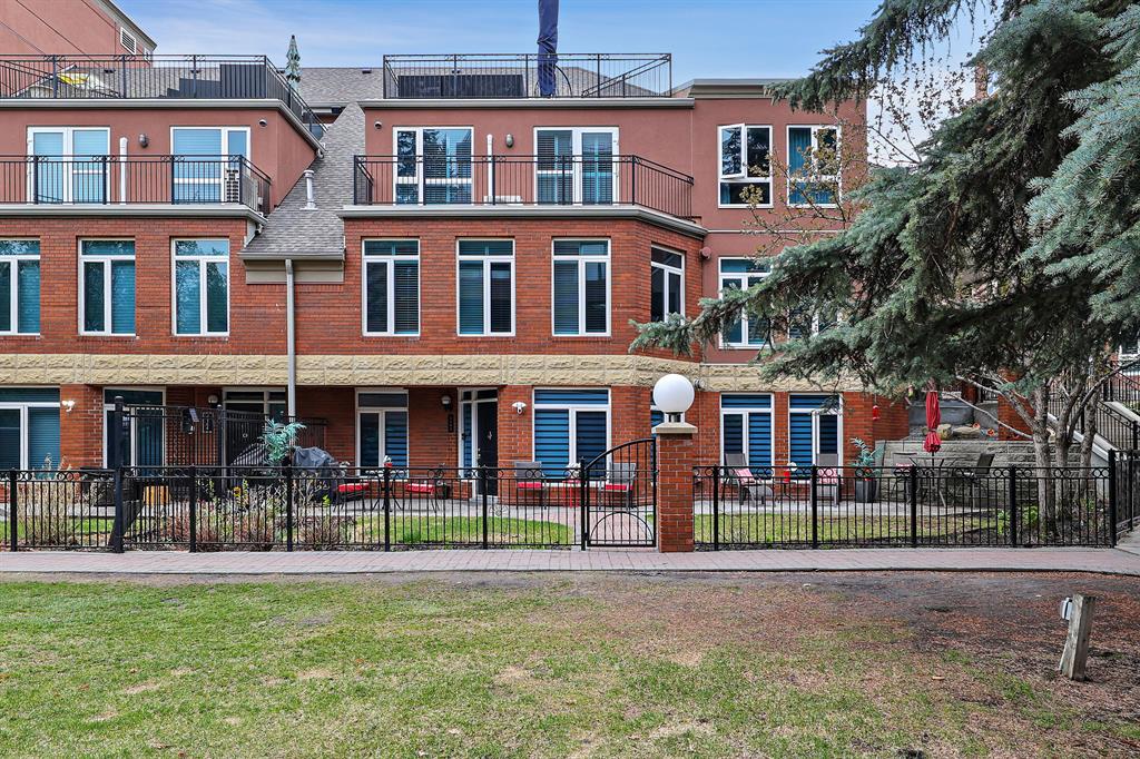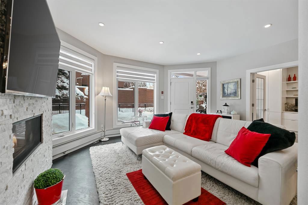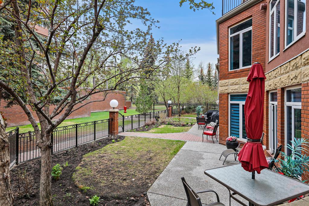 ABSOLUTELY ONE OF THE FINEST INNER CITY CONDO’S THAT CALGARY CAN OFFER! Rare main floor Eau Claire Estates condo with 2 bedrooms / 2 bath home. Truly a modern lifestyle living experience in an secure apartment setting – custom designed and built with extensive renovations, upgrades and superior concrete building quality. Over 1218 + square feet plus an exclusive outdoor fenced living area with a dual patio layout and private entry, in the heart of the city. You’ll be impressed with the inner city walkability to shops, restaurants, schools (private , daycare & public), LRT, pathways, health care needs, and all with expansive views of Prince’s Island Park and city downtown core. The island offers an abundance of year round outdoor “all age activities” such as, arts and music festival events, River Café restaurant, playground, biking, project and rental tool site, walking trails, skating, and minutes to the Zoo and Science Centre. Check out the pictures, and 3D tour video. Rich curb appeal with architectural features, extensive upgrades inside and the details are superb. Grand entry with a beautifully appointed open floor plan with high 9′ ceilings and hardwood floors. Chef’s kitchen includes spectacular white quartzite counter tops, full-height custom white gloss cabinets doors, slide in smooth top electric stove with an overhead microwave hood fan, dark grey stainless steel appliances, under mount black granite sink, wall pantry, custom tiled back splash, and a large dining with a built in wall hutch and more views. You’ll also enjoy the entertaining potential with the open layout showcasing the adjacent living room with a elegant white stone faced gas fireplace. The 16′ x 14′ living room features large bright west facing windows and easy access to outdoor patio living space. South patio – 19′ x 10′ + North patio 14′ x 11′. A stately main floor den / office / bedroom with a glass french doors and a walk-in closet. Offering modern lifestyle flexibility for your home office. Other convenient features include a back foyer with direct access to your titled parking stall, storage locker, In suit laundry room, private half bath, and no need to wait for an elevator with your grocery’s or packages. In suit laundry room. A central hallway separates the primary bedroom and full bath. The main primary bedroom includes more views of the private south patio, a spa like ensuite with dual under mount sinks, over-sized jetted tub with 10 mil glass door, and a expansive walk in closet complete this stunning owners suite. BONUS: under ground visitor parking stalls, very unique and fenced street-side entrance into unit, assigned storage locker – #72, pet friendly, and the home is ready to move into and enjoy this summer. Call your friendly REALTOR(R) to book a viewing!