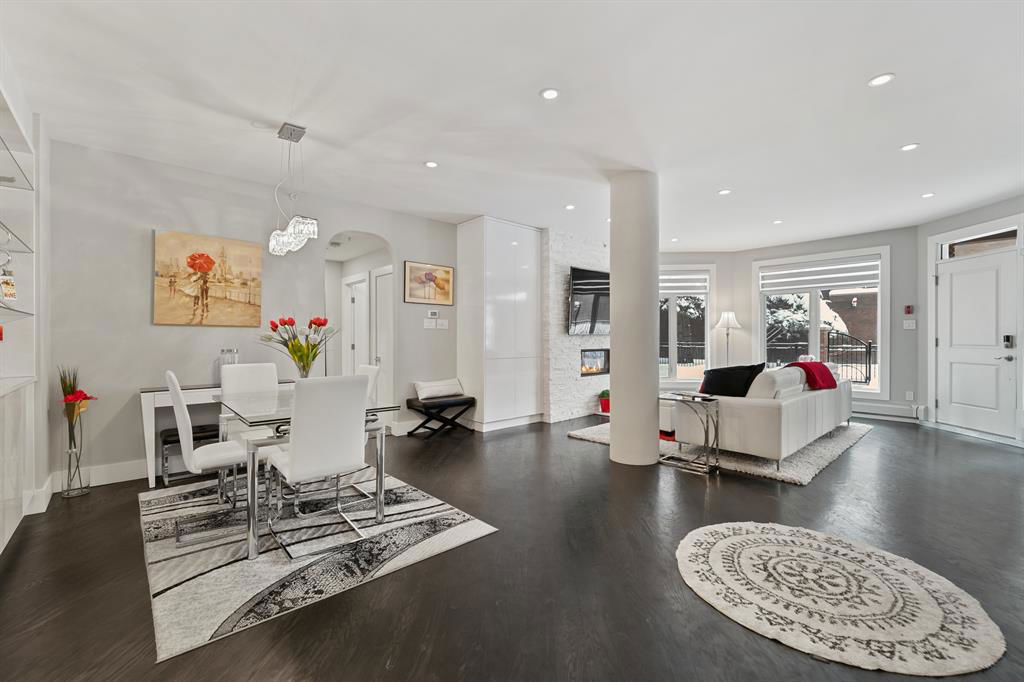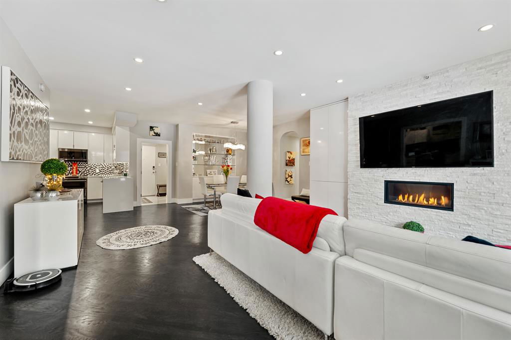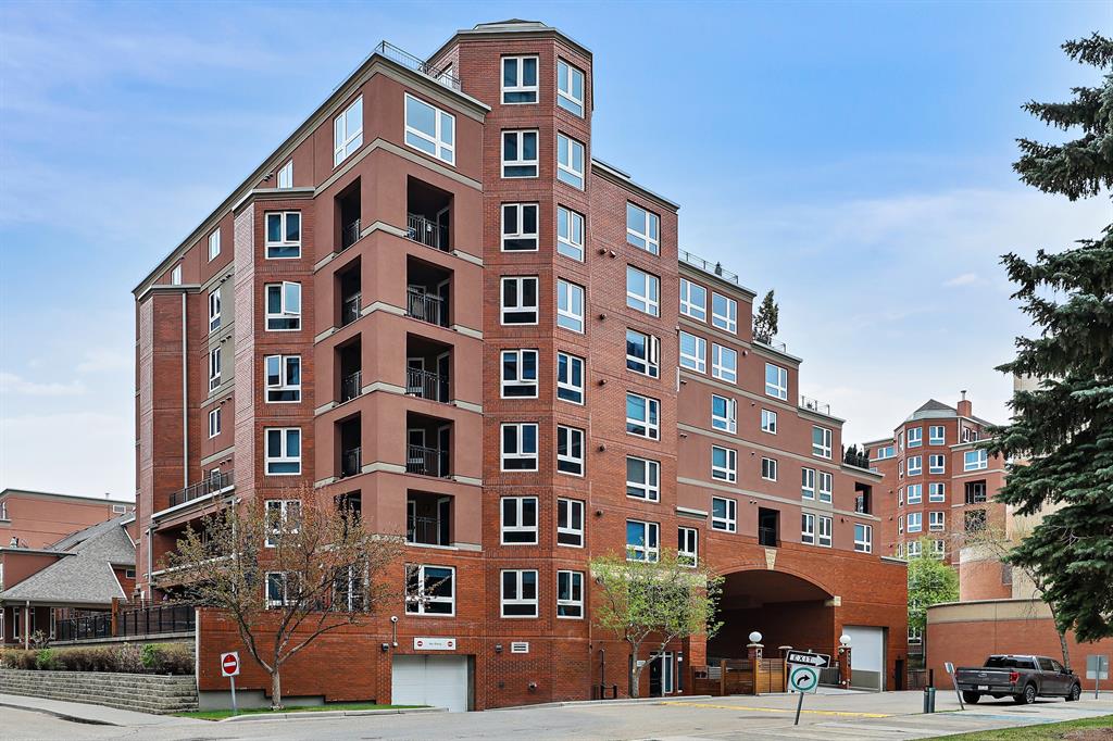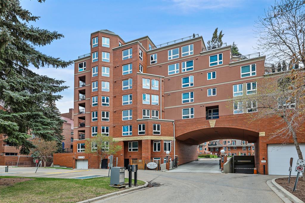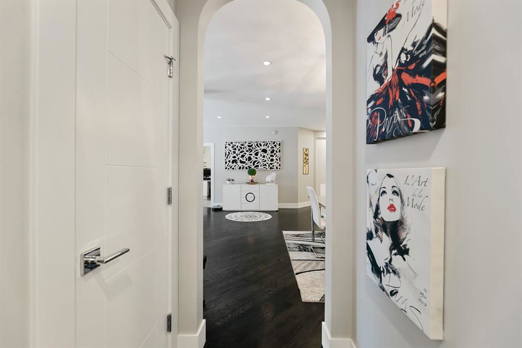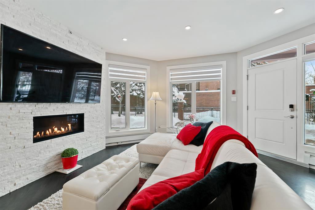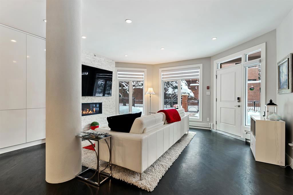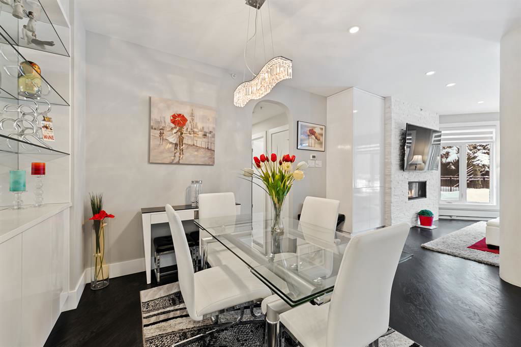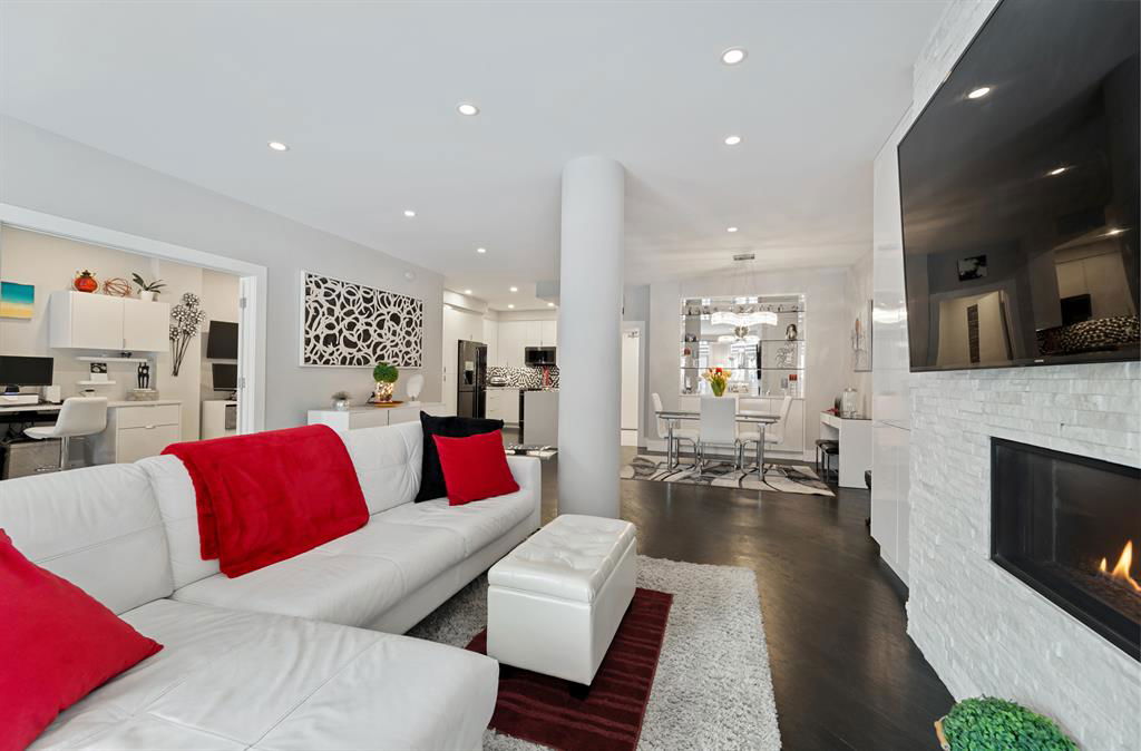 ABSOLUTELY ONE OF THE FINEST INNER CITY CONDO’S THAT CALGARY CAN OFFER! Rare main floor Eau Claire Estates condo with 2 bedrooms / 2 bath home. Truly a modern lifestyle living experience in an secure apartment setting – custom designed and built with extensive renovations, upgrades and superior concrete building quality. Over 1218 + square feet plus an exclusive outdoor fenced living area with a dual patio layout and private entry, in the heart of the city. You’ll be impressed with the inner city walkability to shops, restaurants, schools (private , daycare & public), LRT, pathways, health care needs, and all with expansive views of Prince’s Island Park and city downtown core. The island offers an abundance of year round outdoor “all age activities” such as, arts and music festival events, River Café restaurant, playground, biking, project and rental tool site, walking trails, skating, and minutes to the Zoo and Science Centre. Check out the pictures, and 3D tour video. Rich curb appeal with architectural features, extensive upgrades inside and the details are superb. Grand entry with a beautifully appointed open floor plan with high 9′ ceilings and hardwood floors. Chef’s kitchen includes spectacular white quartzite counter tops, full-height custom white gloss cabinets doors, slide in smooth top electric stove with an overhead microwave hood fan, dark grey stainless steel appliances, under mount black granite sink, wall pantry, custom tiled back splash, and a large dining with a built in wall hutch and more views. You’ll also enjoy the entertaining potential with the open layout showcasing the adjacent living room with a elegant white stone faced gas fireplace. The 16′ x 14′ living room features large bright west facing windows and easy access to outdoor patio living space. South patio – 19′ x 10′ + North patio 14′ x 11′. A stately main floor den / office / bedroom with a glass french doors and a walk-in closet. Offering modern lifestyle flexibility for your home office. Other convenient features include a back foyer with direct access to your titled parking stall, storage locker, In suit laundry room, private half bath, and no need to wait for an elevator with your grocery’s or packages. In suit laundry room. A central hallway separates the primary bedroom and full bath. The main primary bedroom includes more views of the private south patio, a spa like ensuite with dual under mount sinks, over-sized jetted tub with 10 mil glass door, and a expansive walk in closet complete this stunning owners suite. BONUS: under ground visitor parking stalls, very unique and fenced street-side entrance into unit, assigned storage locker – #72, pet friendly, and the home is ready to move into and enjoy this summer. Call your friendly REALTOR(R) to book a viewing!