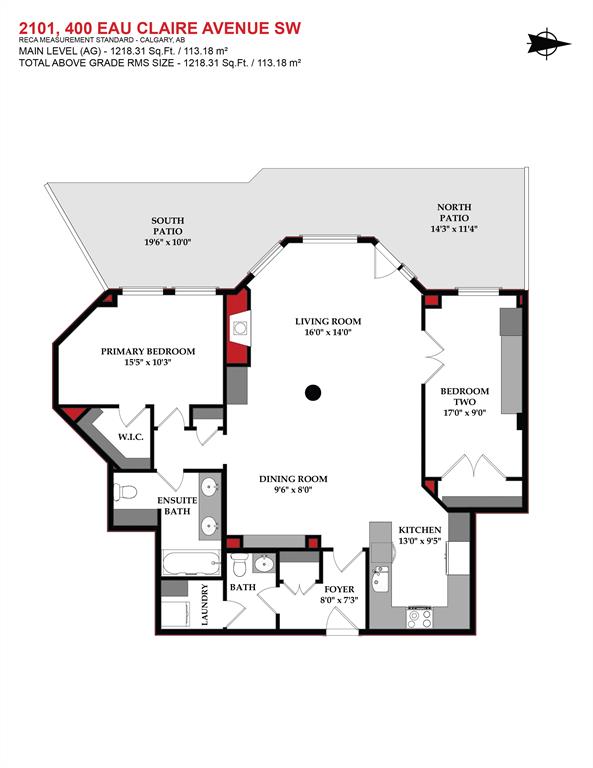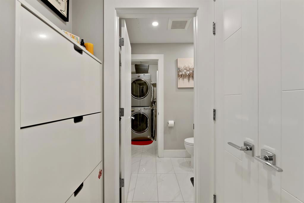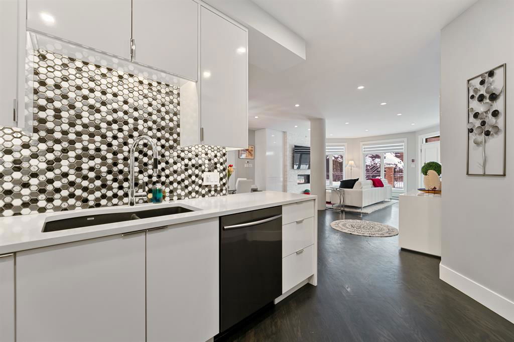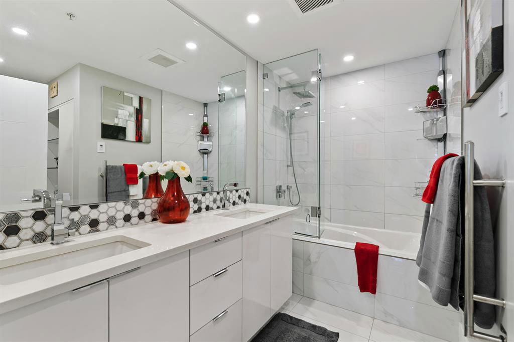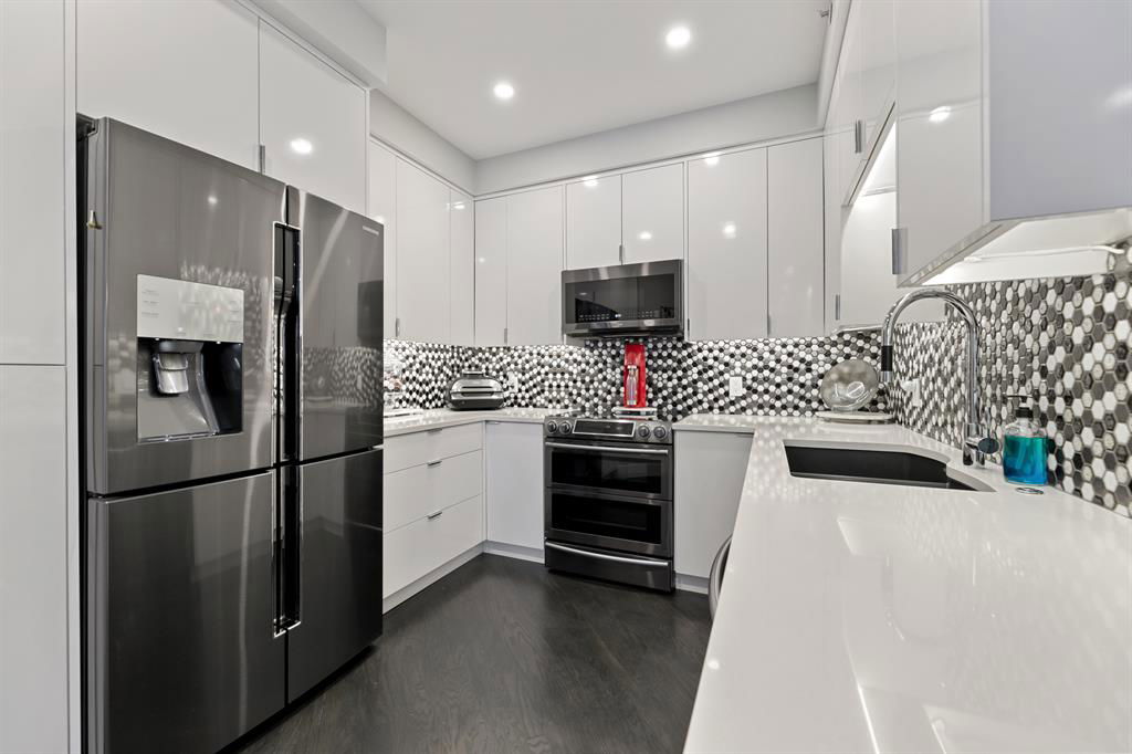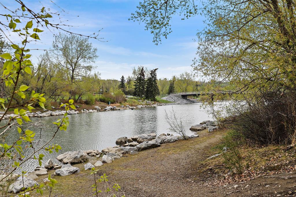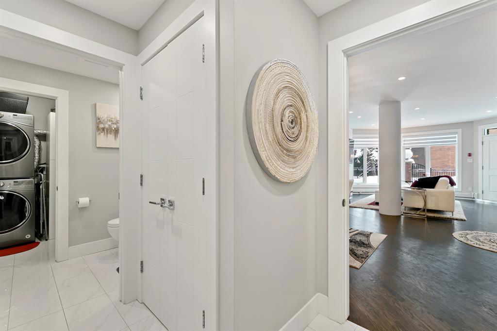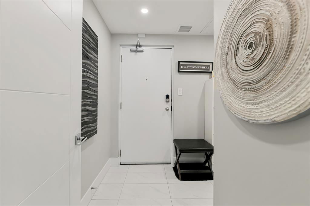ABSOLUTELY ONE OF THE FINEST INNER CITY CONDO’S THAT CALGARY CAN OFFER! Rare main floor Eau Claire Estates condo with 2 bedrooms / 2 bath home. Truly a modern lifestyle living experience in an secure apartment setting – custom designed and built with extensive renovations, upgrades and superior concrete building quality. Over 1218 + square feet plus an exclusive outdoor fenced living area with a dual patio layout and private entry, in the heart of the city. You’ll be impressed with the inner city walkability to shops, restaurants, schools (private , daycare & public), LRT, pathways, health care needs, and all with expansive views of Prince’s Island Park and city downtown core. The island offers an abundance of year round outdoor “all age activities” such as, arts and music festival events, River Café restaurant, playground, biking, project and rental tool site, walking trails, skating, and minutes to the Zoo and Science Centre. Check out the pictures, and 3D tour video. Rich curb appeal with architectural features, extensive upgrades inside and the details are superb. Grand entry with a beautifully appointed open floor plan with high 9′ ceilings and hardwood floors. Chef’s kitchen includes spectacular white quartzite counter tops, full-height custom white gloss cabinets doors, slide in smooth top electric stove with an overhead microwave hood fan, dark grey stainless steel appliances, under mount black granite sink, wall pantry, custom tiled back splash, and a large dining with a built in wall hutch and more views. You’ll also enjoy the entertaining potential with the open layout showcasing the adjacent living room with a elegant white stone faced gas fireplace. The 16′ x 14′ living room features large bright west facing windows and easy access to outdoor patio living space. South patio – 19′ x 10′ + North patio 14′ x 11′. A stately main floor den / office / bedroom with a glass french doors and a walk-in closet. Offering modern lifestyle flexibility for your home office. Other convenient features include a back foyer with direct access to your titled parking stall, storage locker, In suit laundry room, private half bath, and no need to wait for an elevator with your grocery’s or packages. In suit laundry room. A central hallway separates the primary bedroom and full bath. The main primary bedroom includes more views of the private south patio, a spa like ensuite with dual under mount sinks, over-sized jetted tub with 10 mil glass door, and a expansive walk in closet complete this stunning owners suite. BONUS: under ground visitor parking stalls, very unique and fenced street-side entrance into unit, assigned storage locker – #72, pet friendly, and the home is ready to move into and enjoy this summer. Call your friendly REALTOR(R) to book a viewing!