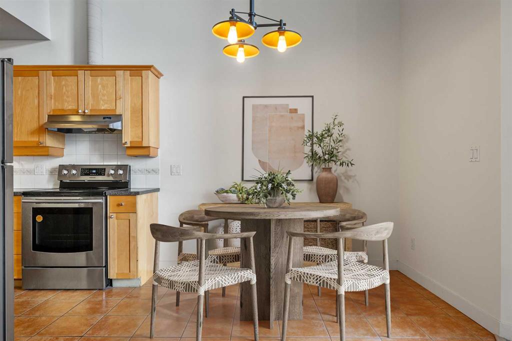 A dramatic wall of south-facing windows floods the main living area with natural light, highlighting the industrial-chic touches like exposed ductwork and wide-plank flooring. The efficient kitchen is appointed with warm maple cabinetry, while the freestanding gas fireplace adds a cozy focal point—ideal for Calgary’s colder months.
