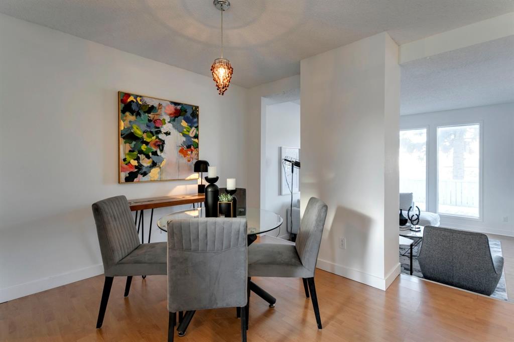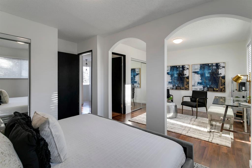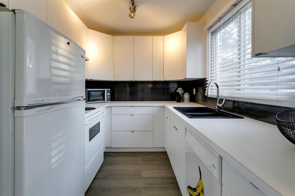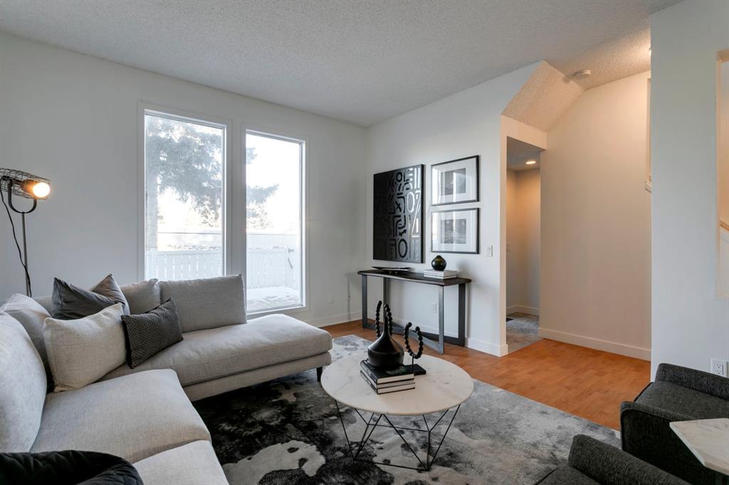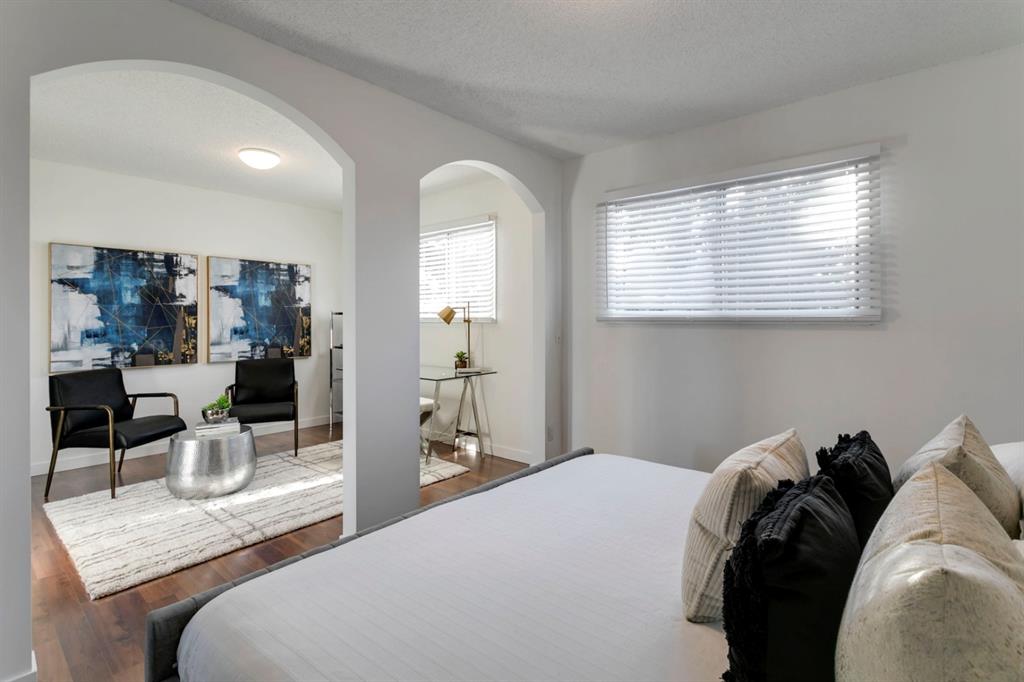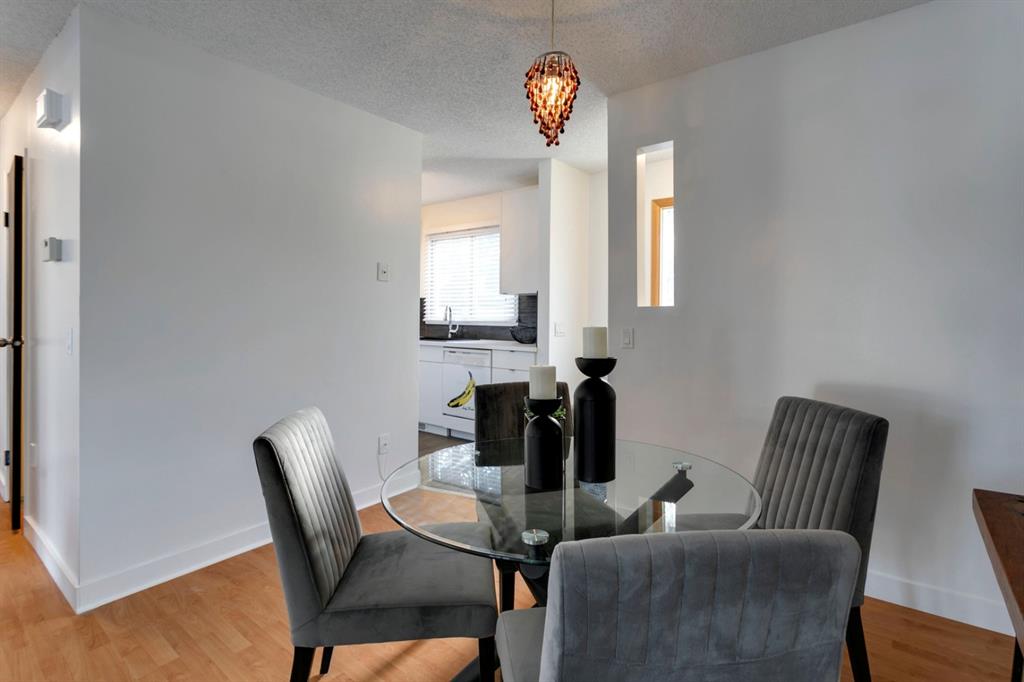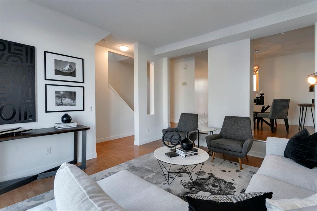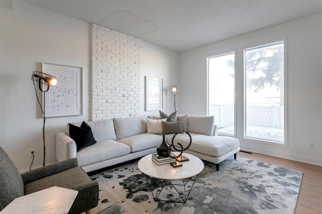 Looking for an upgrade from the typical starter home? This renovated townhome is absolutely stunning. Inside the front door, a sleek remodeled kitchen is done in pristine white with stylish black accents, and this space offers a fantastic amount of cupboard and counter space. The dining room is on this level as well, with a design that highlights the interesting architecture and open layout, and there’s a powder room here, too. The sunken living area features high ceilings, and massive windows fill the room with gorgeous sunshine, while brick details add a dramatic flair. Outside, the new deck is nearly as big as the indoor living space, and this is an end unit so it’s extremely private. The primary bedroom is utterly magical… Custom renovations have created two delightful archways that divide a luxurious sitting area or home office from the bedroom, and there are two closets as well as two doors for the ideal work from home arrangement. The second bedroom is also spacious, and the bathroom and a linen closet are set between the two rooms. Now, as much as you may want to just stay in the amazing master, there is one more floor to explore, and this one is important! The basement is partially developed with a giant rec area that is begging for your home theatre, gym equipment, or both. The other half of this level is cleverly set up with laundry, a hobby area and workbench, as well as tons of built-in shelving and space to store everything else you can think of. As for the location, there are very few places that have such great access to everything you could want or need. Both the Sirocco and 45 Street LRT station are within walking distance, and this complex backs on to a small strip mall, where you will find one of the most popular pubs in Calgary, the Regal Beagle. Just on the other side of Sarcee Trail, West Market Square in rich in amenities, and there are walking paths here as well. Set on the corner of two primary routes, the whole city is easily accessible, as are the mountains to the west. This one is exceptional, see it today! NOTE: No DOGS are allowed at the complex