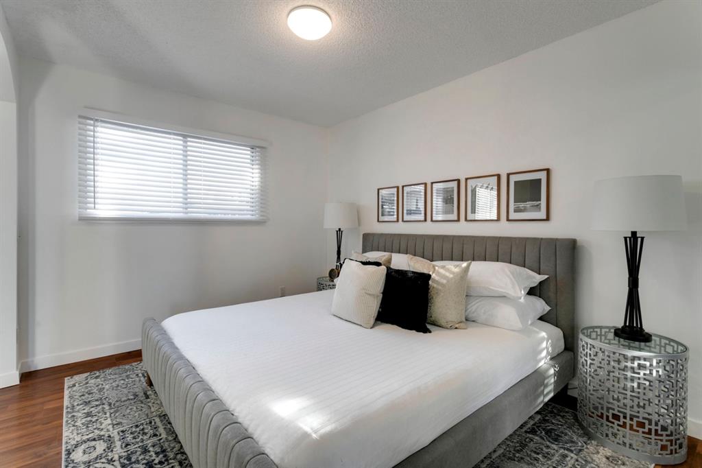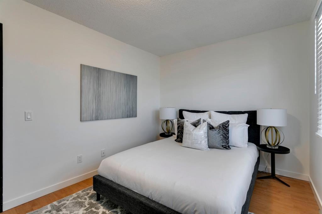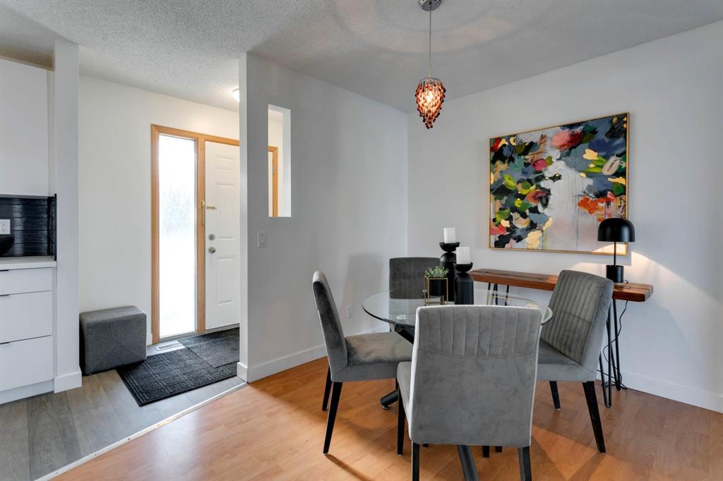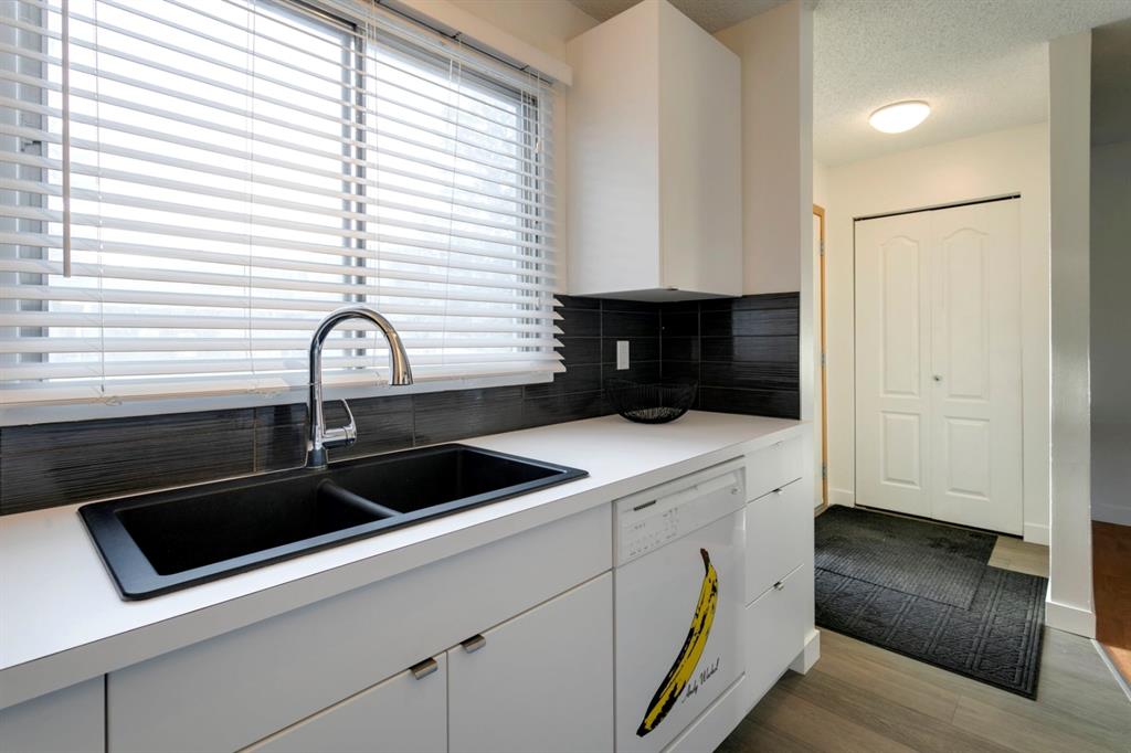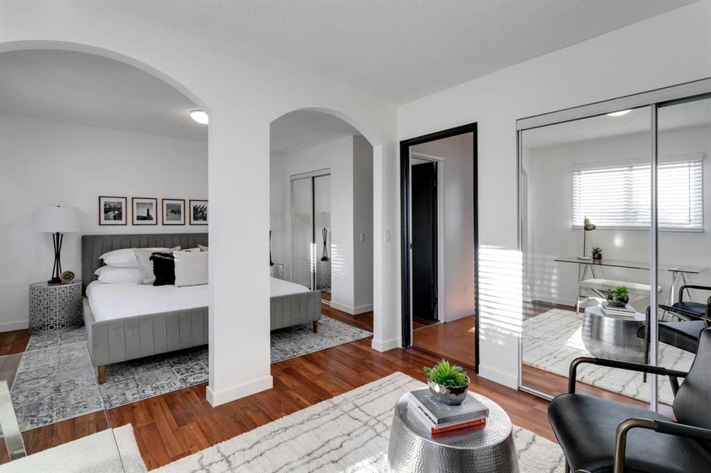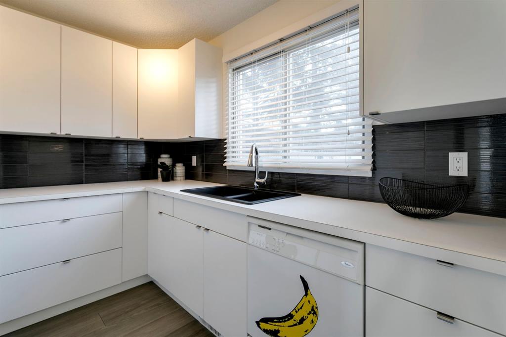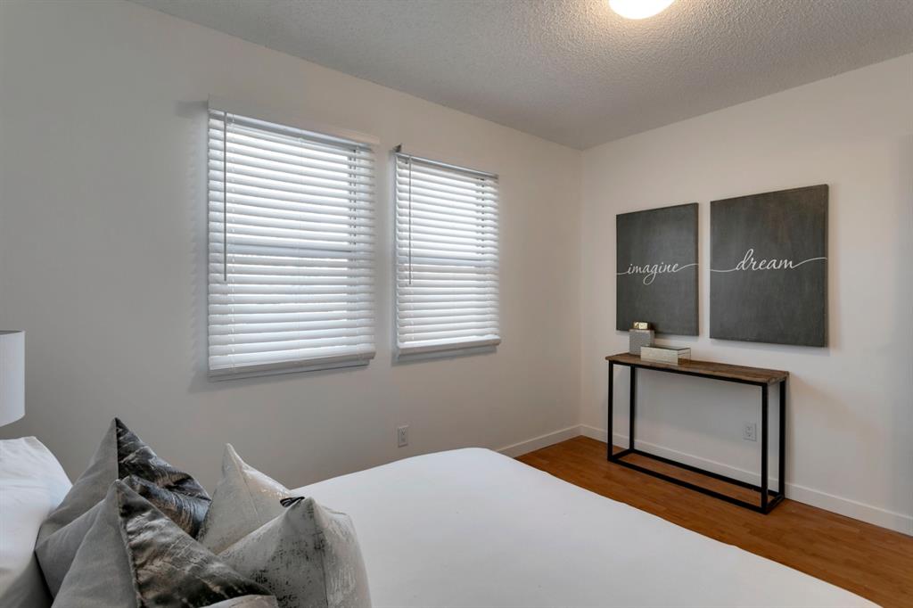 Looking for an upgrade from the typical starter home? This renovated townhome is absolutely stunning. Inside the front door, a sleek remodeled kitchen is done in pristine white with stylish black accents, and this space offers a fantastic amount of cupboard and counter space. The dining room is on this level as well, with a design that highlights the interesting architecture and open layout, and there’s a powder room here, too. The sunken living area features high ceilings, and massive windows fill the room with gorgeous sunshine, while brick details add a dramatic flair. Outside, the new deck is nearly as big as the indoor living space, and this is an end unit so it’s extremely private. The primary bedroom is utterly magical… Custom renovations have created two delightful archways that divide a luxurious sitting area or home office from the bedroom, and there are two closets as well as two doors for the ideal work from home arrangement. The second bedroom is also spacious, and the bathroom and a linen closet are set between the two rooms. Now, as much as you may want to just stay in the amazing master, there is one more floor to explore, and this one is important! The basement is partially developed with a giant rec area that is begging for your home theatre, gym equipment, or both. The other half of this level is cleverly set up with laundry, a hobby area and workbench, as well as tons of built-in shelving and space to store everything else you can think of. As for the location, there are very few places that have such great access to everything you could want or need. Both the Sirocco and 45 Street LRT station are within walking distance, and this complex backs on to a small strip mall, where you will find one of the most popular pubs in Calgary, the Regal Beagle. Just on the other side of Sarcee Trail, West Market Square in rich in amenities, and there are walking paths here as well. Set on the corner of two primary routes, the whole city is easily accessible, as are the mountains to the west. This one is exceptional, see it today! NOTE: No DOGS are allowed at the complex