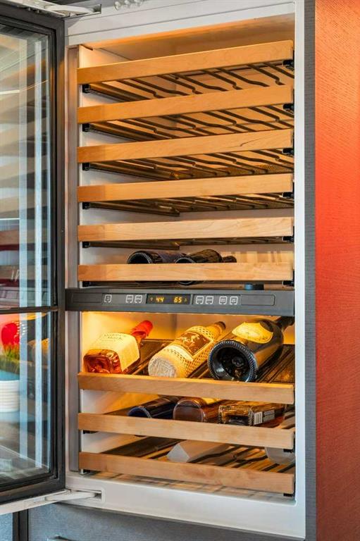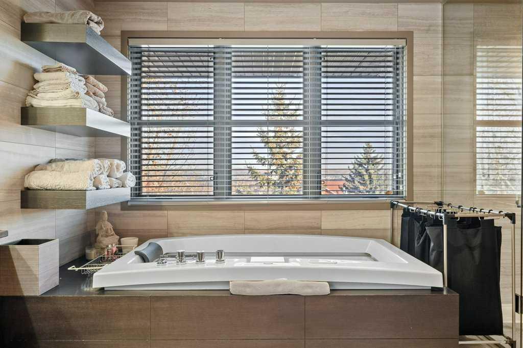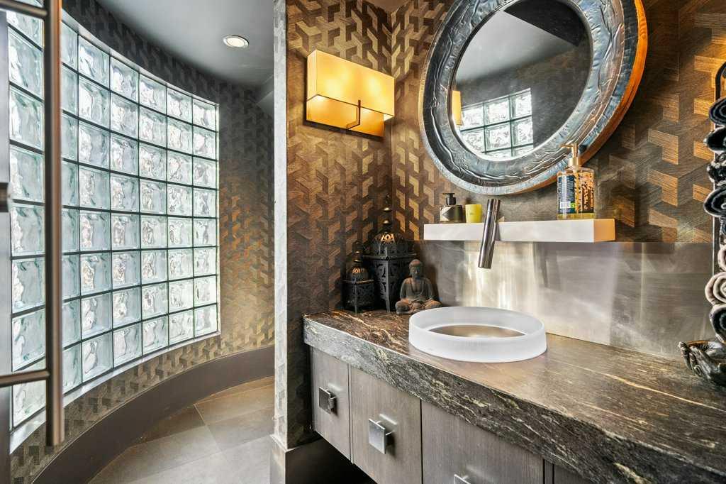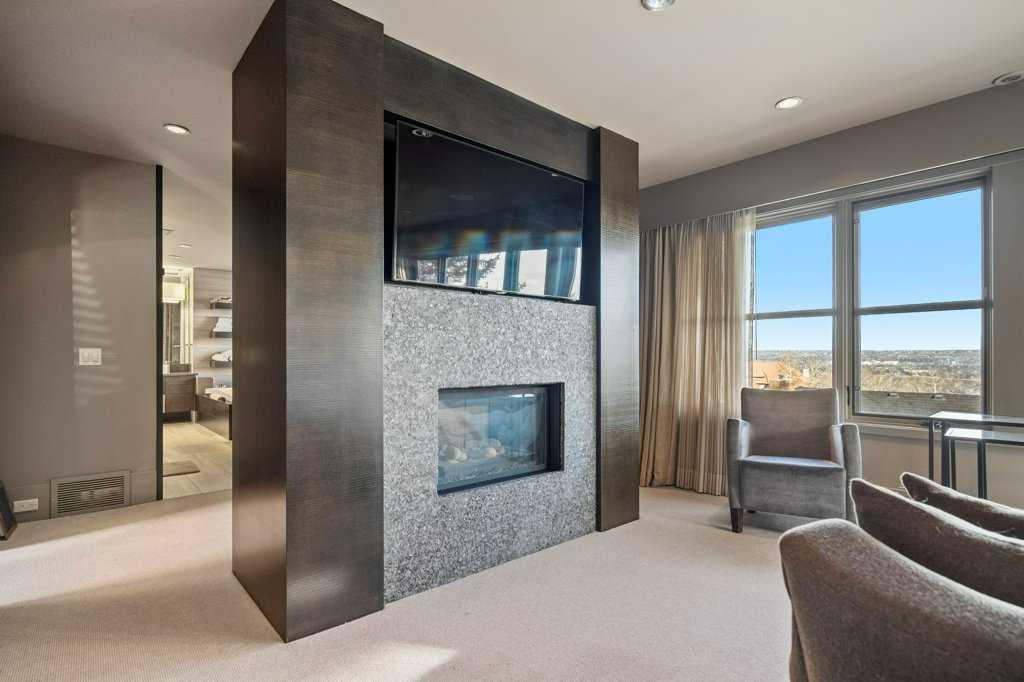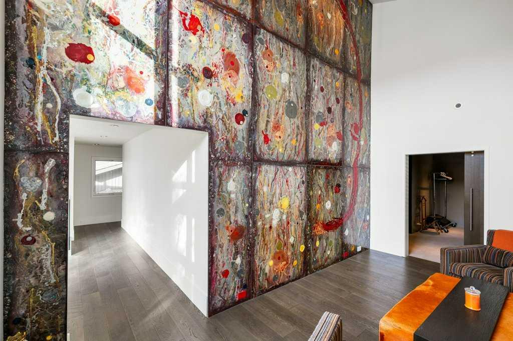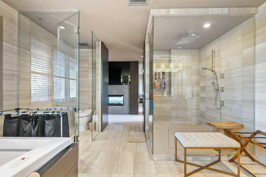 Upstairs, four luxurious bedrooms feature plush high-end wool berber carpet, while a well-appointed laundry room offers built-in storage and hanging space. A full bathroom with a rain-shower head ensures added comfort. The Primary Suite is an owner’s retreat, complete with a private sitting room and its own gas fireplace. The primary ensuite is nothing short of spectacular, featuring a dual vanity, heated flooring, luxurious jetted tub, water closet, and a spacious glass-enclosed shower. A decadent walk-in closet with built-in shelving and drawers with ample storage. The breathtaking, original custom art installation by artist, Jason GoGo, in the sitting area next to the Primary suite is visible from both the main and upper levels.