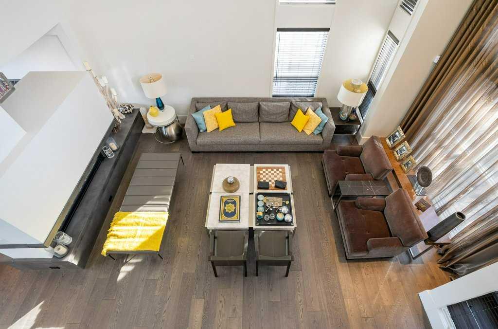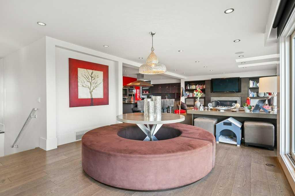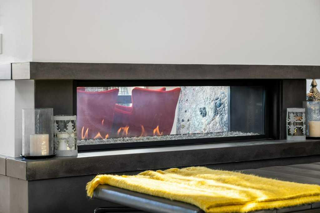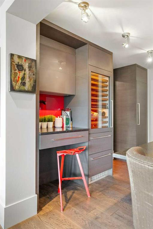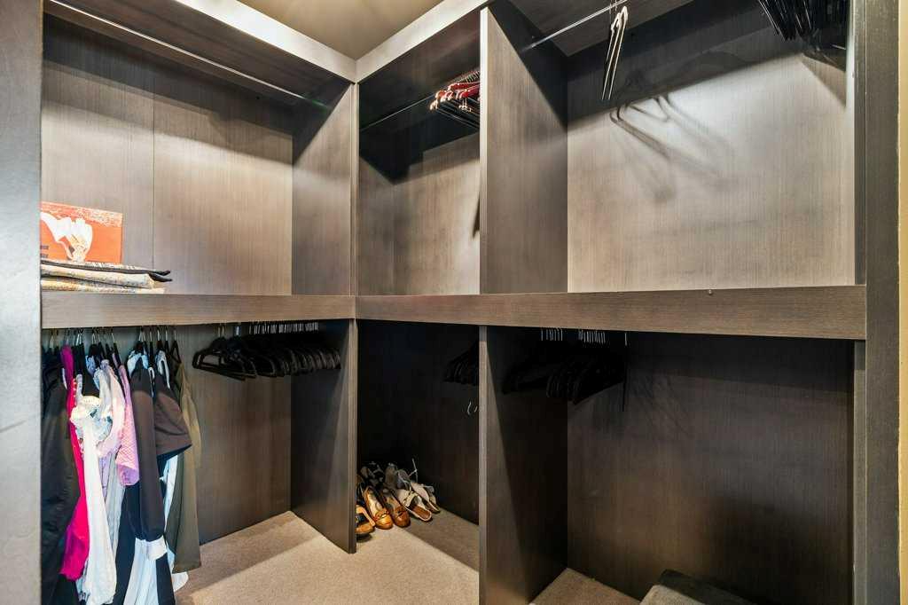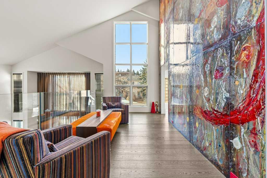 Upstairs, four luxurious bedrooms feature plush high-end wool berber carpet, while a well-appointed laundry room offers built-in storage and hanging space. A full bathroom with a rain-shower head ensures added comfort. The Primary Suite is an owner’s retreat, complete with a private sitting room and its own gas fireplace. The primary ensuite is nothing short of spectacular, featuring a dual vanity, heated flooring, luxurious jetted tub, water closet, and a spacious glass-enclosed shower. A decadent walk-in closet with built-in shelving and drawers with ample storage. The breathtaking, original custom art installation by artist, Jason GoGo, in the sitting area next to the Primary suite is visible from both the main and upper levels.