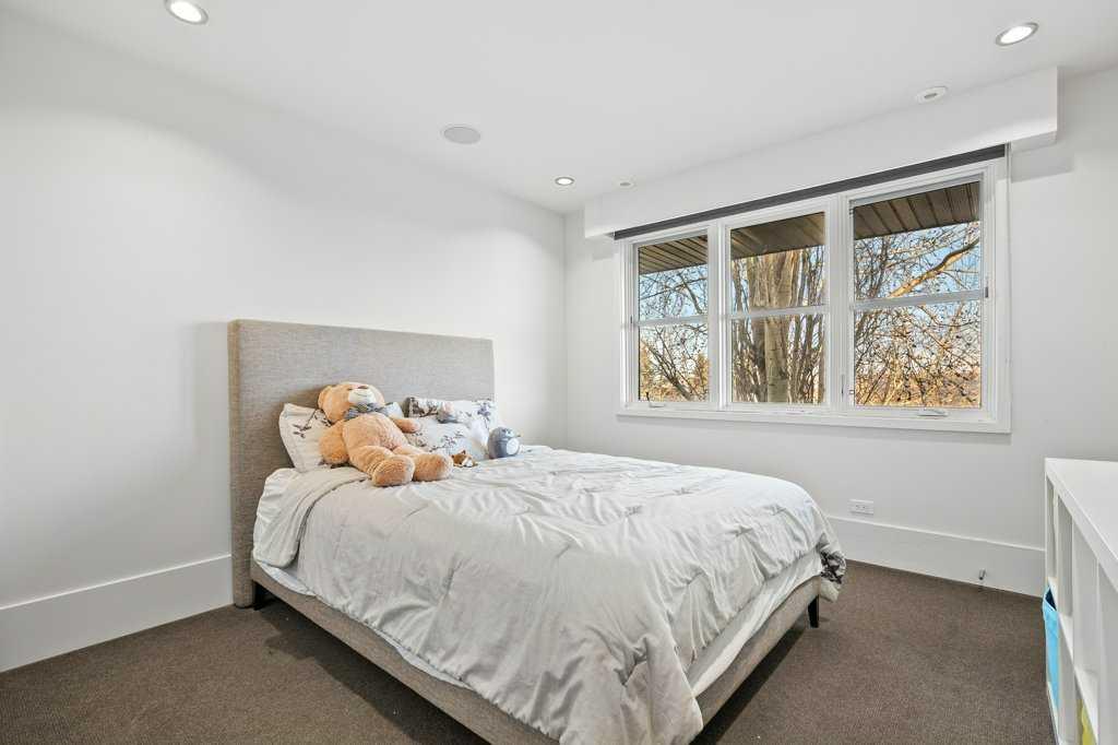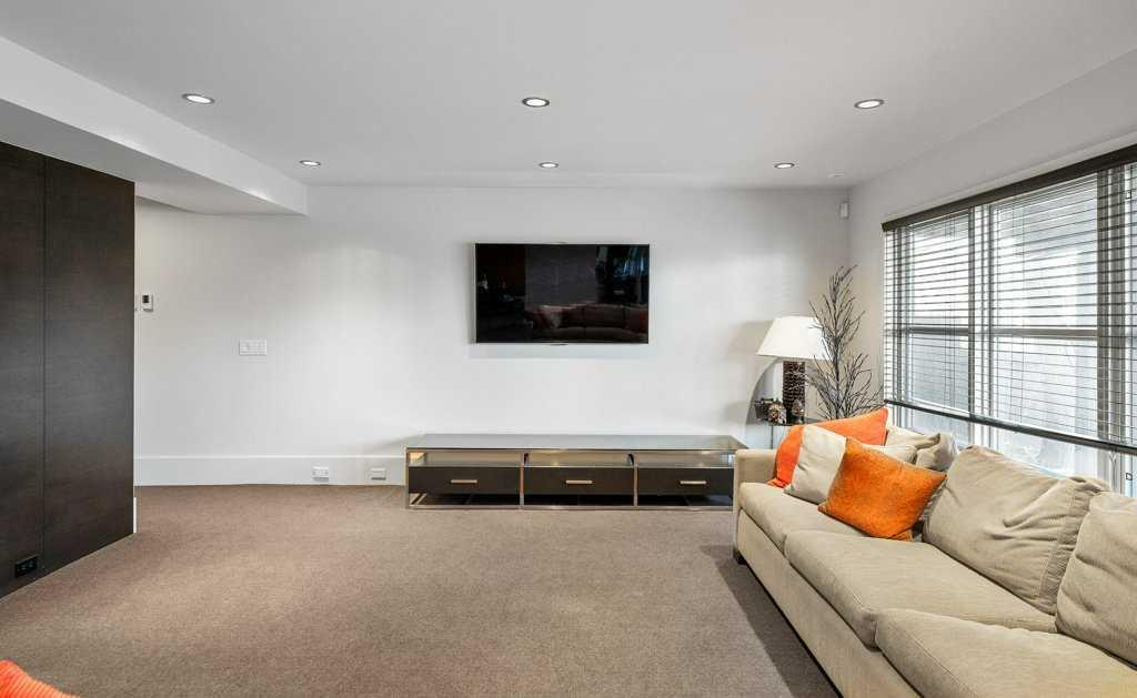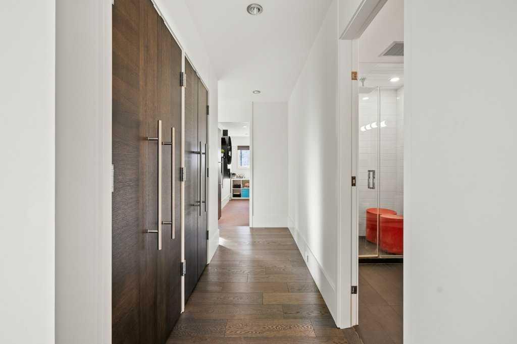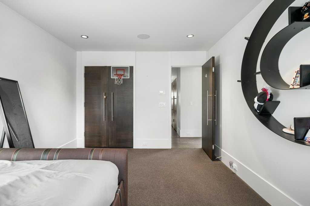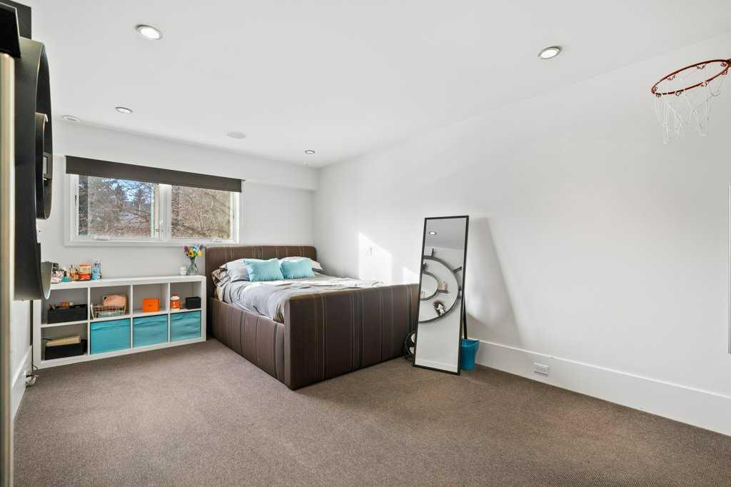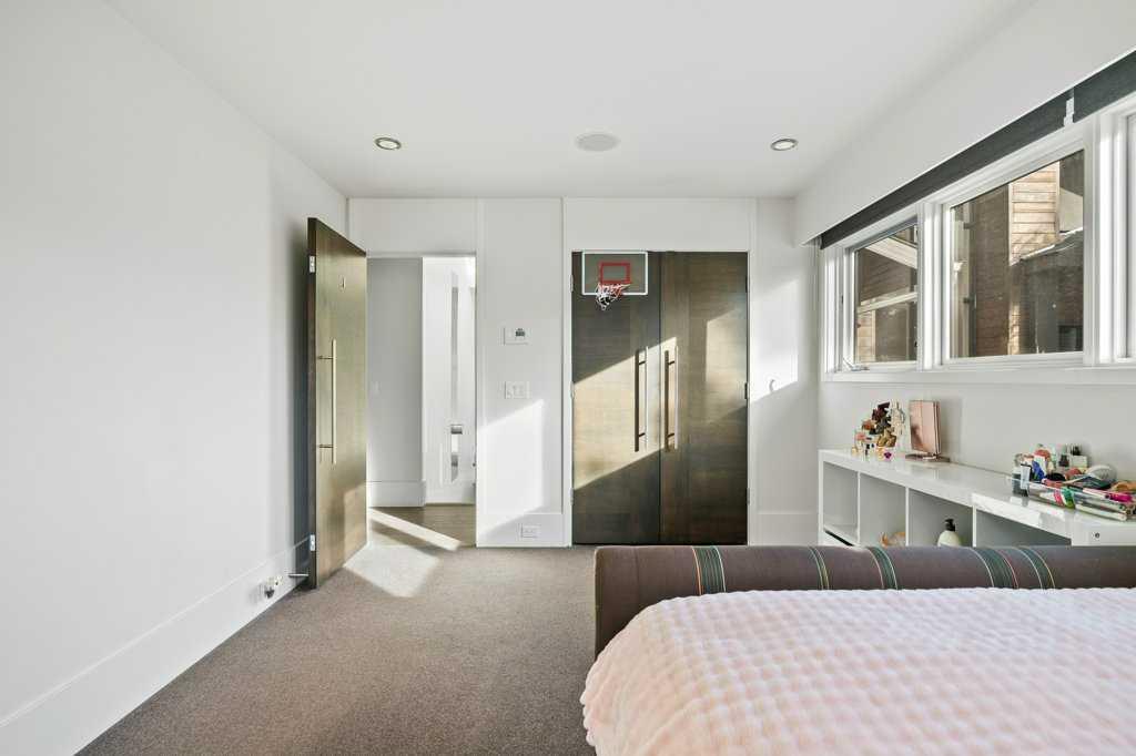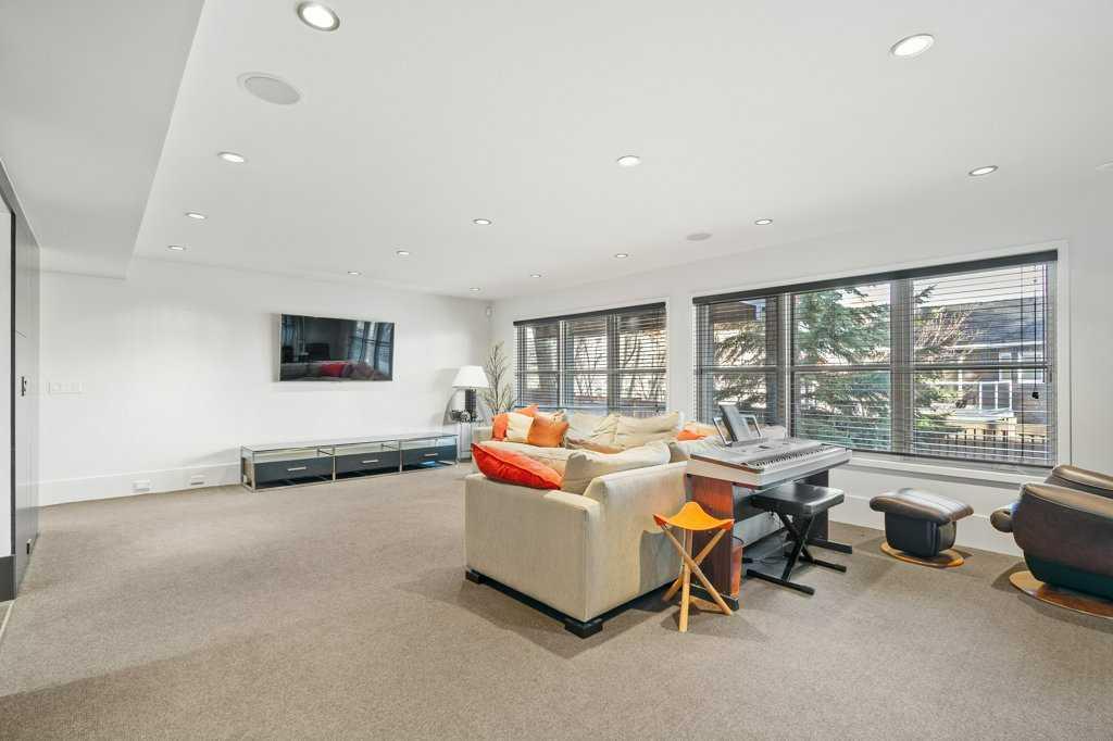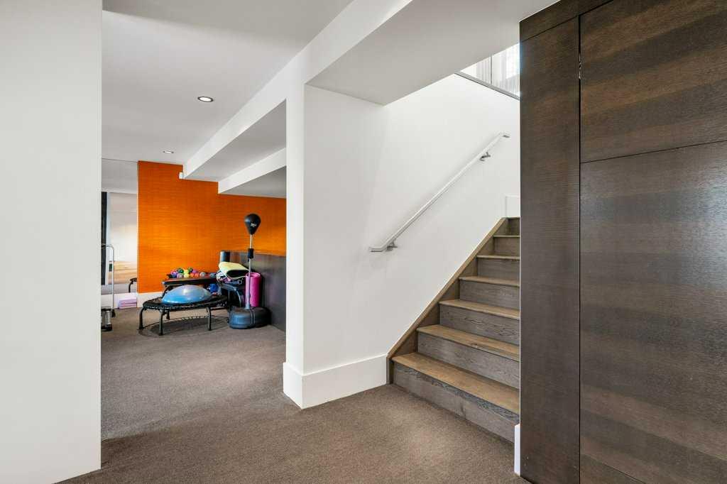 The lower level walkout, a space which has it all – an additional bedroom, spacious family room, smaller bonus room, gym, storage, and two 3-piece bathrooms. A kitchenette, equipped with a SUBZERO fridge/freezer, ASKO washer and dryer, microwave, and two Fisher & Paykel dishwashers make this an ideal space for guests or multigenerational living. The gym, with a mirror wall, leads you outside to a large covered deck in the low maintenance backyard.